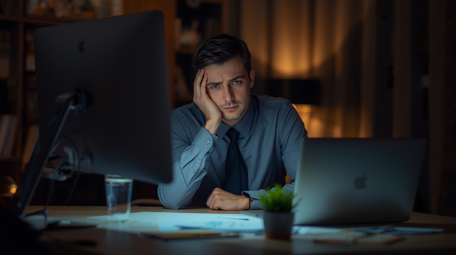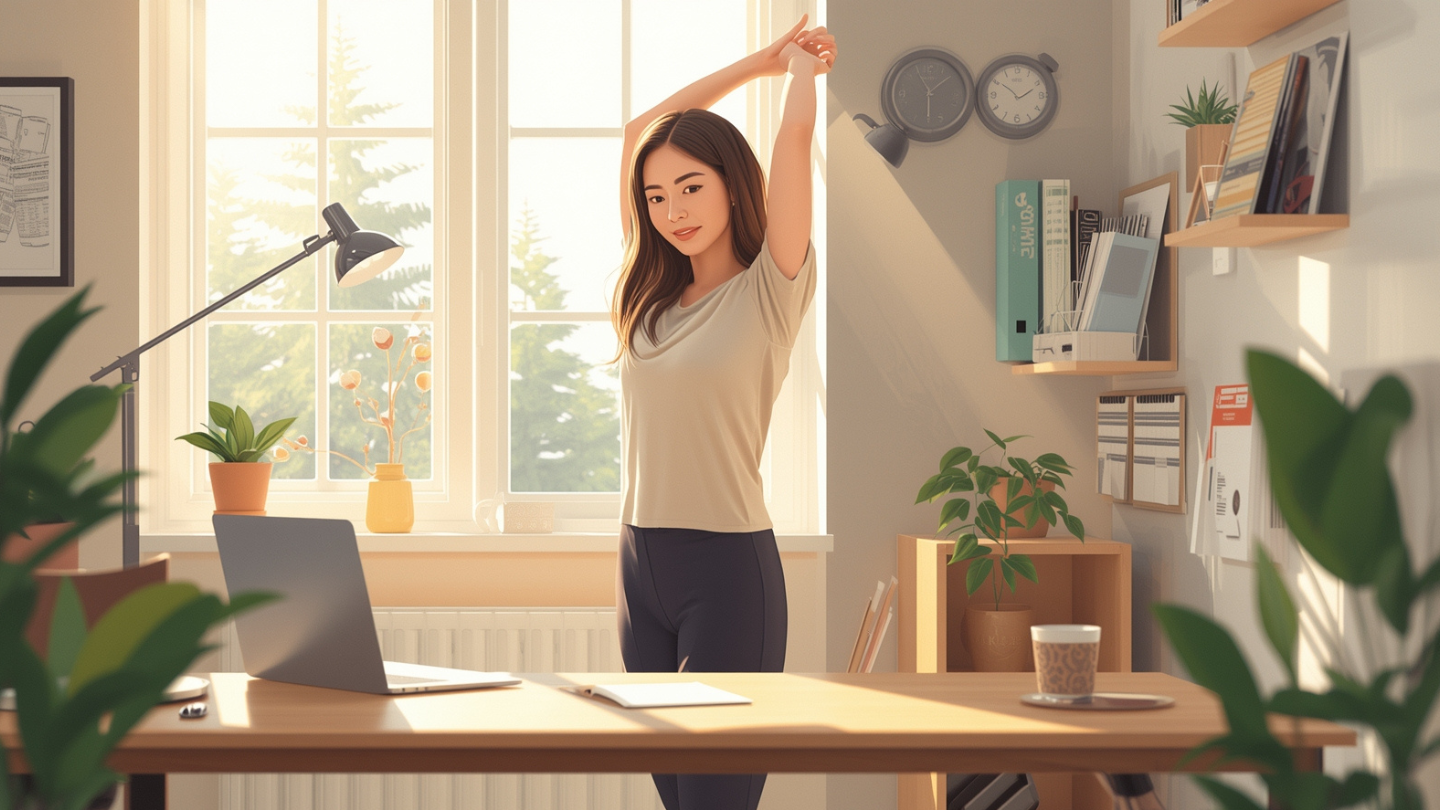 Gambar ini menggambarkan suasana kantor yang hangat dengan seorang pekerja yang terlihat kelelahan di depan laptop. Di meja terlihat segelas air putih dan tanaman kecil sebagai simbol keseimbangan yang sering dilupakan di tengah rutinitas kerja. Visual ini menggambarkan dampak kebiasaan buruk sehari-hari seperti duduk terlalu lama, kurang istirahat, dan lupa menjaga hidrasi.