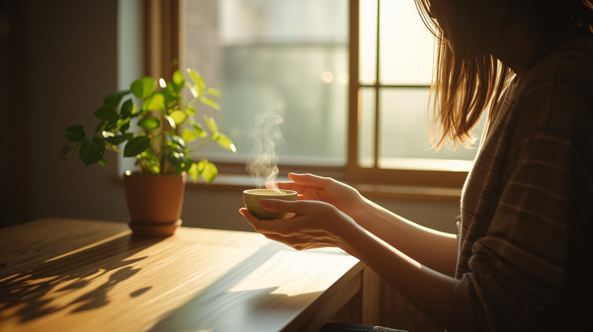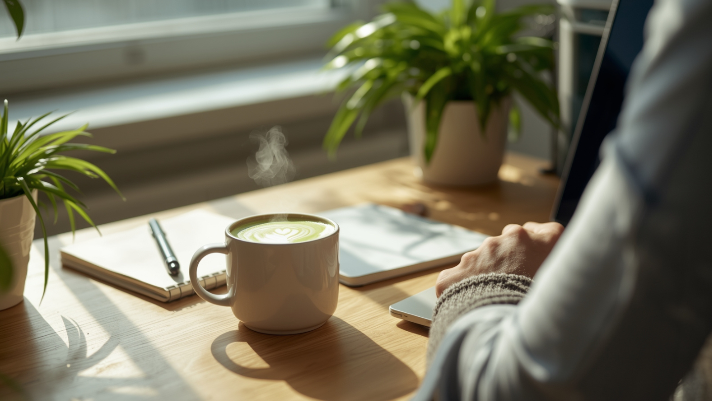 “Fokus tetap tajam tanpa jitak kafein — cukup dengan secangkir matcha hangat.”