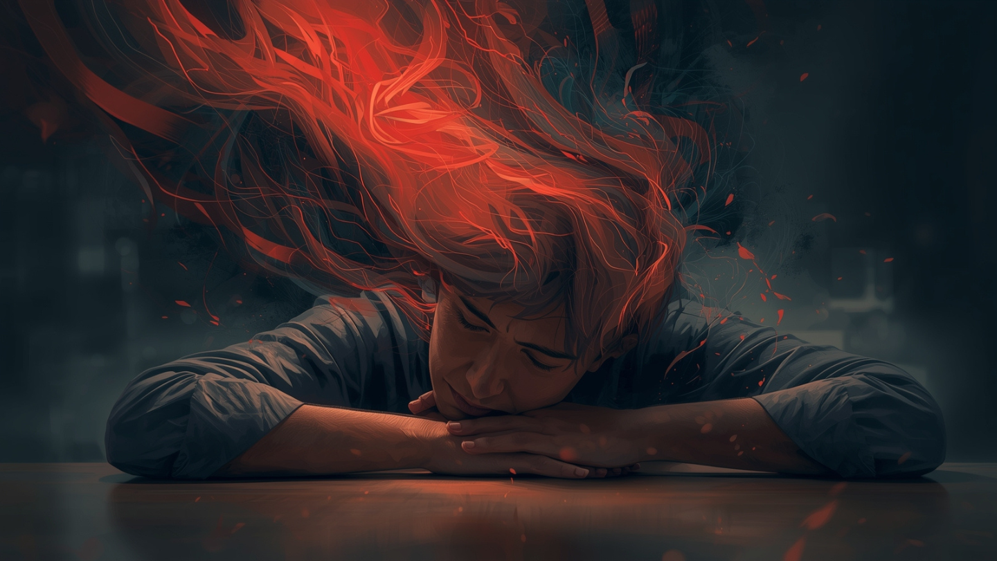 “Setiap warna merah di kepala adalah simbol beban pikiran yang belum dilepaskan — tubuh hanya bisa sembuh saat pikiran diizinkan beristirahat.”