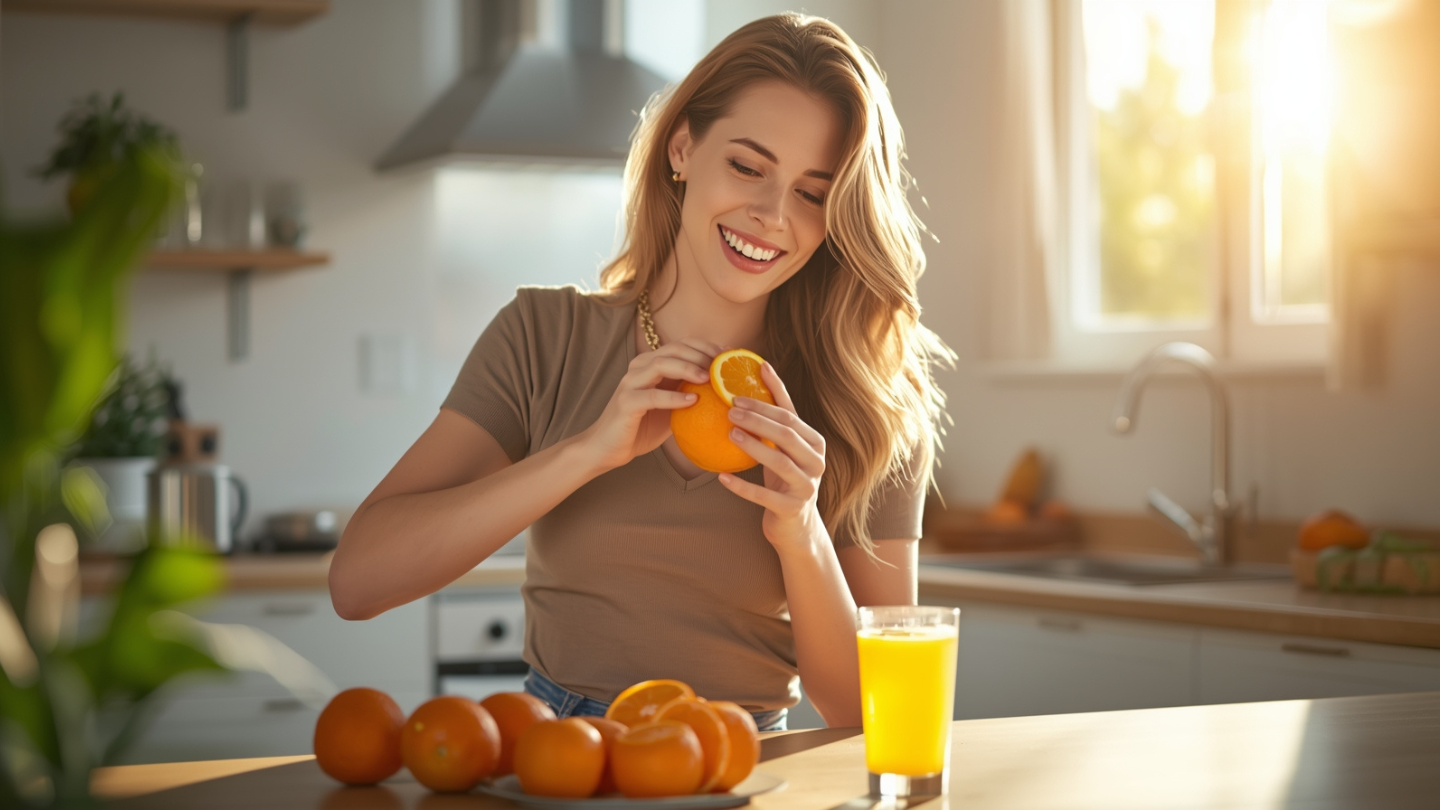 “Awali hari dengan segelas jus jeruk segar — sumber alami vitamin C yang menyalakan semangat.”