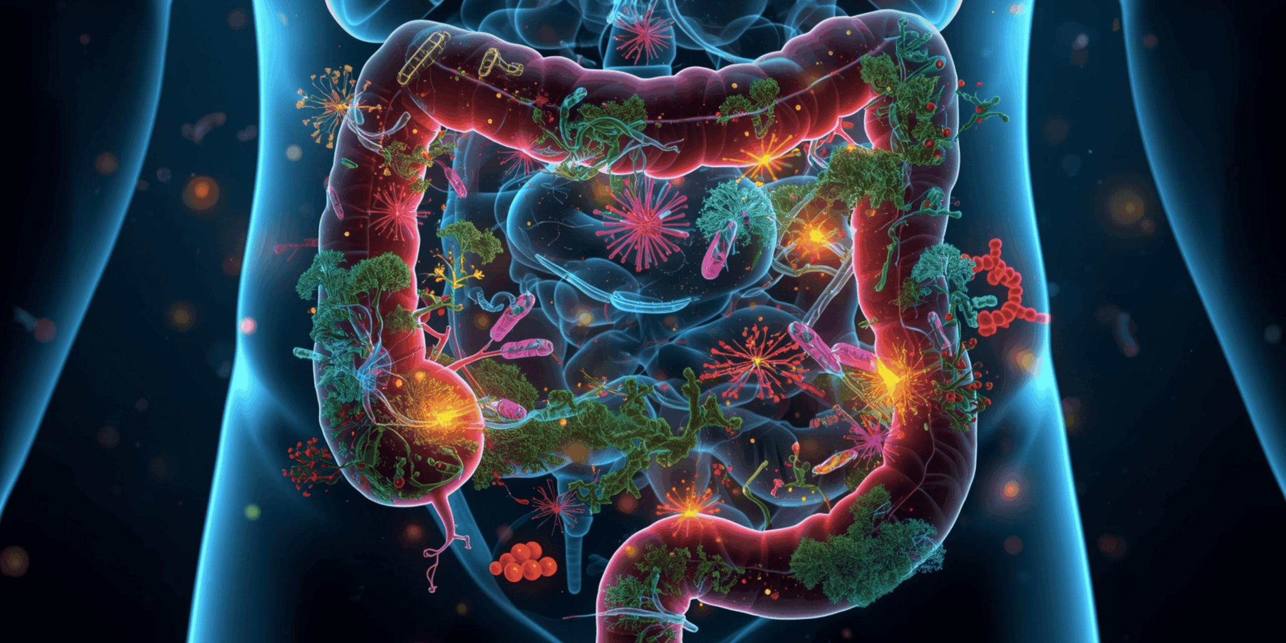 Ilustrasi konseptual ekosistem mikrobioma dalam usus — sumber: Leonardo AI, 2025.